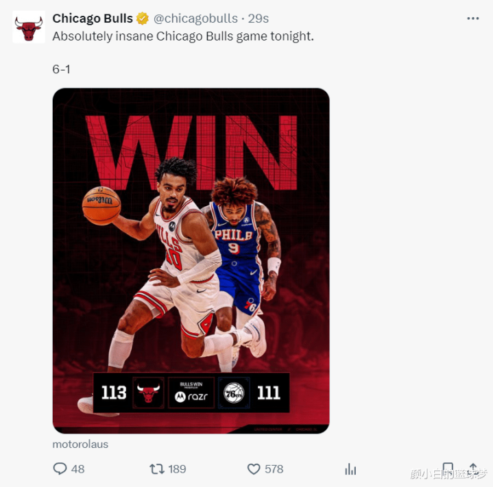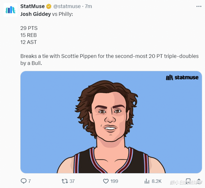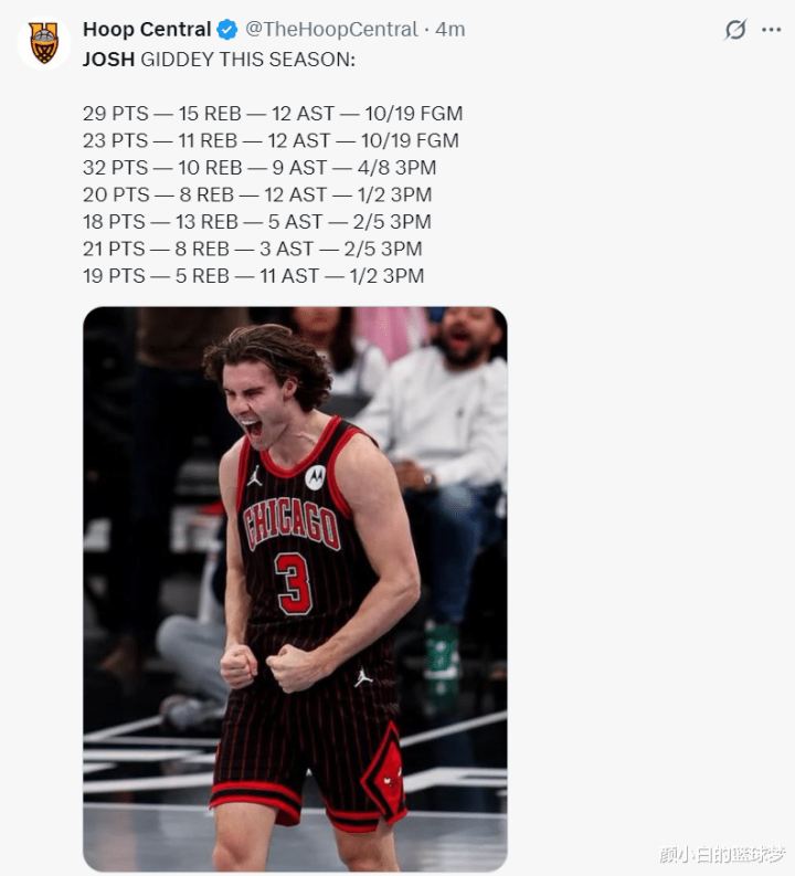 The Chicago Bulls completed a super reversal when they were 24 points behind Philadelphia. Vucevic completed a three-pointer from the corner. Vucevic scored 19 points and 10 rebounds (just 1 three-pointer). Vucevic was definitely the hero of Chicago this night, but the person who really helped the team reverse was Josh Guidi. Vucevic's three-pointer was scored by Gidi's breakthrough, which attracted three double-teams and then assisted. Gidi's current offensive threat is very great. He no longer has any weaknesses. He also made 2 of 4 three-pointers in this game. In addition, the last 7-0 run of the Bulls was all related to Gidi. Gidi hit a pull-up layup 2 minutes and 39 seconds before the end. Gidi hit a breakthrough again 1 minute and 19 seconds before the end, narrowing the point difference to 1 point. After Maxi missed three times, the Bulls paused. Gidi launched an attack with 11.4 seconds before the end, and Vucevic completed the quasi-win. In other words, Philadelphia had a scoring drought of 2 minutes and 39 seconds. In 37 minutes of the game, Gidi made 10 of 19 shots, 2 of 4 three-pointers, and 7 of 8 free throws. He scored 29 points, 15 rebounds, 12 assists, and 1 steal. His shooting percentage was 52.6%, his three-point shooting percentage was 50%, his true shooting percentage was 64.4%, and his plus-minus value was +8. He set multiple records in this campaign: 1. He had triple-doubles in two consecutive games; 2. For the eighth time in the Bulls' career, he surpassed Pippen with 20+ triple-doubles and became second in team history, second only to Jordan; 3. Gidi became the first Bulls player to achieve two consecutive triple-doubles in two consecutive games since Jordan in the 1988-89 season; 4. Gidi became the first player since Jokic to achieve two consecutive triple-doubles this season. US media revealed that Gidi’s statistics this season are super comprehensive. This 2.01-meter-tall point guard is so powerful that he is so strong without the three-point weakness. He averages 22.2 points, 9.2 rebounds, 8.7 assists, 0.8 steals and 0.3 blocks per game, shooting 49% from the field and 40.7% from the three-point range. US media: When Gidibe was traded to the Bulls, he was like Westbrook in 2017. In other words, he was supporting Gidibe to win the MVP this season.