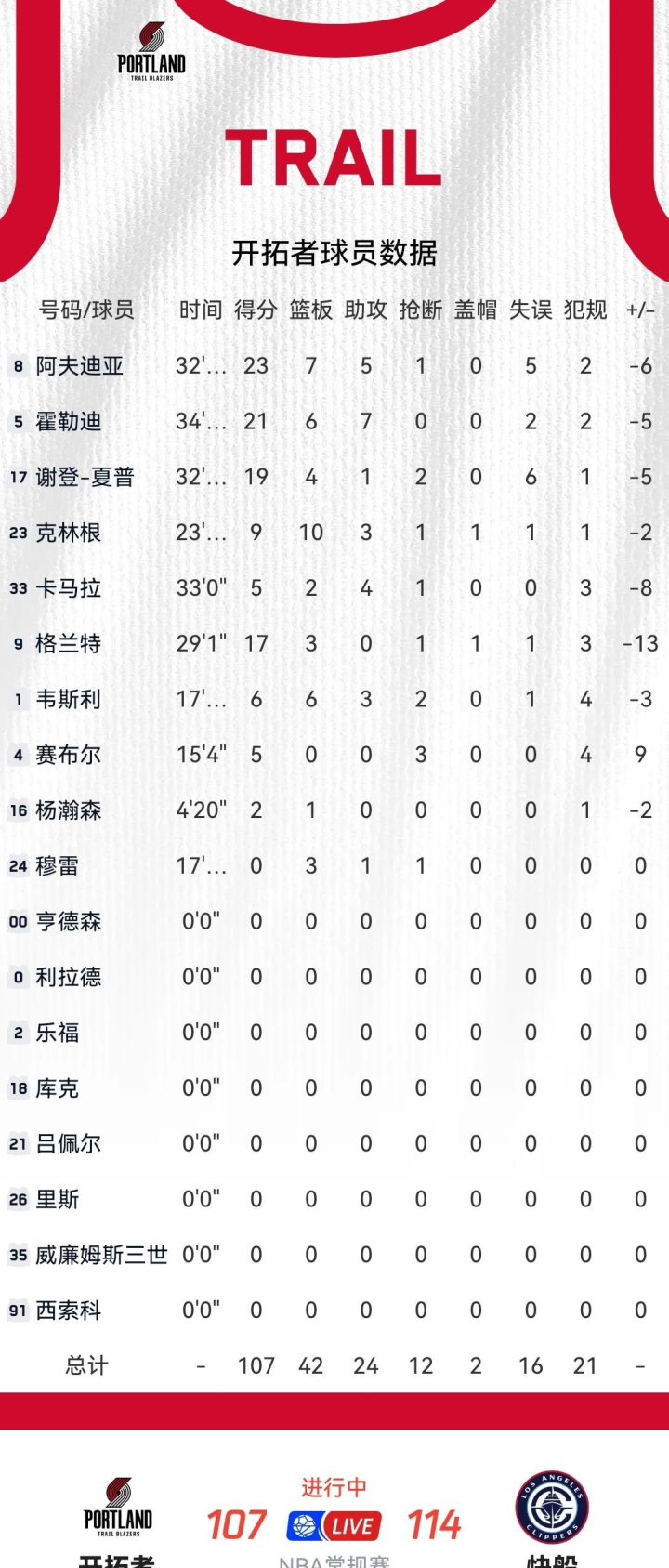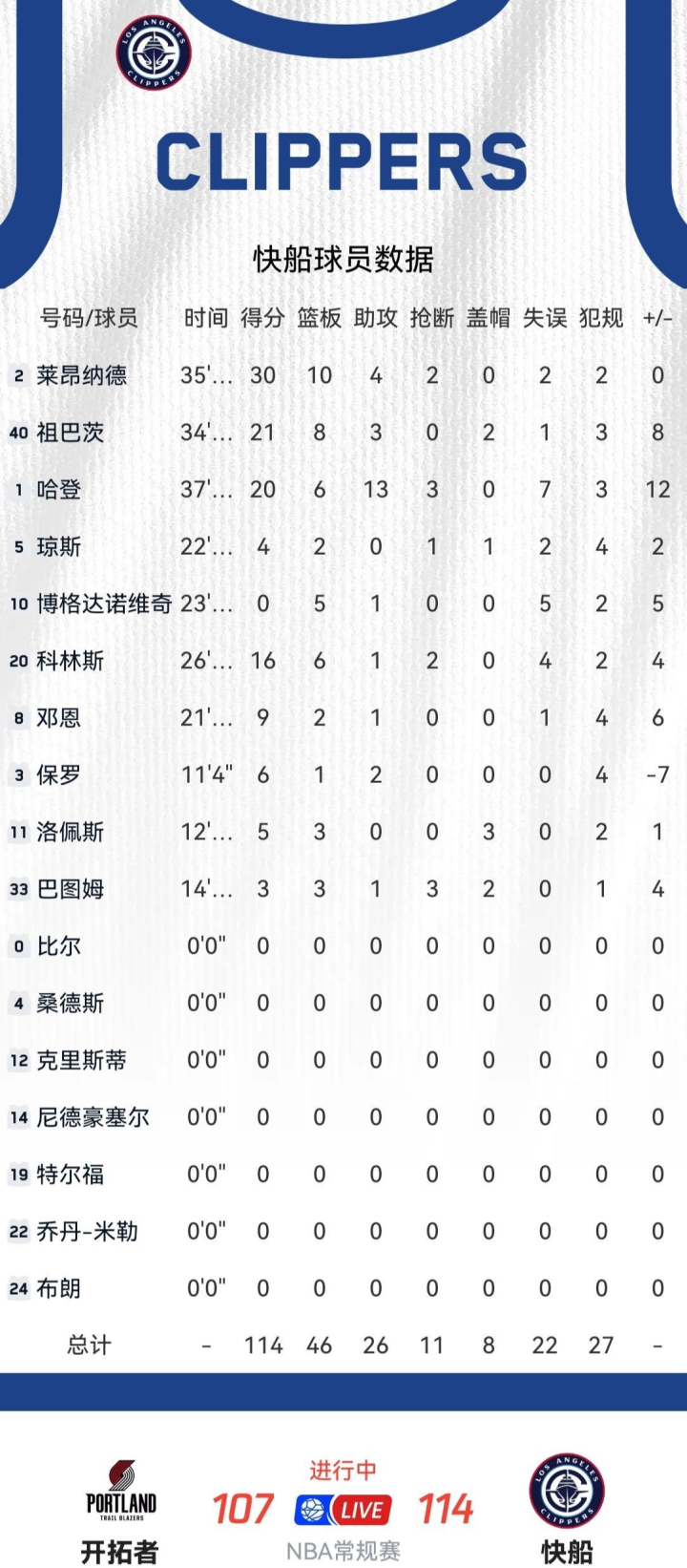 On October 27, 2025, the Clippers will face the Trail Blazers. This game is also full of highlights. Yang Hansen and Harden will have a direct meeting. In this game, the Clippers shooting guard Bill was absent due to injury, and Bogdanovic made his comeback. The Clippers sent the starting five of Zubac, Knicks, Harden, Bogdanovic, and Jones to face the Trail Blazers. Harden performed poorly in the first half, but rebounded in the second half. Kawhi Kawhi and Zubac performed reasonably well. Yang Hansen played generally for more than 4 minutes in the first quarter and had no chance to play in the second quarter. After the final four quarters, the Clippers defeated the Trail Blazers 114:107. Let’s talk about the game first. The Clippers were very strong in the first quarter. Harden made a 3+1, and Kawhi was also accurate in the mid-range shot. They played a 6-0 wave and once led 12-6. Later, the Blazers let Yang Hansen play, and the young man scored 2 points on free throws. After Holiday made a three-pointer, the two sides were tied 14-14. After that, the Clippers made another effort, with an 11-2 spurt, leading 34-23 at the end of the first quarter. I thought the Clippers would go smoothly, but in the second quarter the Trail Blazers changed their lineup to a smaller lineup and suddenly broke out. The Clippers started with 8-2 and chased the score to 31-36. Just as the Clippers responded with a 6-1 to open up to 10 points, Avdija suddenly went crazy and scored 8 points in a row. Wesley also scored 4 points. The Trail Blazers directly hit a 14-0 lead to 46-42. The Blazers didn't stop after that, Klingen scored three points, Sharp scored 6 points in a row, and then hit 9-0, with the score difference reaching 11 points. The Clippers struggled for a while in the final quarter. Kawhi and Zubac made free throws, and Batum made a three-pointer. They played a 9-2 wave to catch up to 55-60. In the end, Kawhi's three-pointer at the buzzer timed out and the Trail Blazers led 60:55 at halftime. At the end of the half for the Clippers, Kawhi and Zubac were carrying the team. Kawhi played 18 minutes and 24 seconds, scoring 13 points, 5 rebounds and 2 assists on 5-of-13 shooting. He was still the core that can attack tough situations. Zubac had 12 points, 6 rebounds and 2 blocks, and he didn't miss out on protecting the frame or scoring inside. Harden's performance was average, scoring 8 points in the half, but he had 7 assists. Bogdanovic just returned and played 13 minutes without scoring a point, which was a bit embarrassing. Paul played more than 5 minutes without scoring. With the performance of the Clippers' role players, it's no wonder they were chased in the second quarter. The team made 11 turnovers and the offense stuttered. In other words, Batum and Lopez made some contributions on the defensive end. Batum had 3 points, 2 rebounds, 2 steals and 1 block, and Lopez had 3 points, 2 rebounds and 1 block. Everyone on the Trail Blazers side was on full alert at halftime. Holiday and Avdija both scored 13 points. Holiday connected the team's offense with 5 assists, and Avdija also had 1 steal. Both offense and defense were online. The bench was really strong. Sharp scored 10 points, Wesley had 4 points, 4 rebounds, 3 assists and 2 steals. Thybulle had 3 points and 1 steal. The plus-minus value was +11. The efficiency of this bench lineup was so scary. Klingen had 7 points, 6 rebounds, 2 assists and 1 block. Grant had 8 points, 1 rebound and 1 steal. The depth of the forward line is good. Our Chinese player Yang Hansen played 4 minutes and 20 seconds and scored 2 points and 1 rebound. Although the time was short, he still showed his face in the NBA. The Trail Blazers had 14 assists, 7 steals, and 6 turnovers in the half. The team's cooperation and turnover control were much better than the Clippers. Their reversal in the second quarter relied on this. The biggest problem for the Clippers in the half was that the role players were too stretched and made too many mistakes. Harden is not in good shape either. If it continues to be like this in the second half, it will be too difficult for the Clippers to come back. They have to find a way to let the role players increase their offensive efficiency and reduce mistakes. Otherwise, if the Blazers rush off the bench again, the point difference will be completely widened. The third quarter became the turning point of the game. The Clippers hit a 32-22 offensive climax in a single quarter, winning by 10 points to achieve a lead. In the fourth quarter, the Trail Blazers fought back with all their strength, losing only 2 points 25-27 in a single quarter, but the Clippers firmly controlled the situation and suppressed the opponent's counterattack momentum with key points and defense. After the final four quarters, the opponent was defeated 114-107. The Clippers' core and role players have blossomed more in this game. Leonard scored 30 points, 10 rebounds and 4 assists, making 11 of 21 shots and 4 of 6 three-pointers. He was the core of the team's attack. Harden contributed 20 points, 6 rebounds and 13 assists, and connected the team with 6 of 12 shots. Zubac scored 21 points, 8 rebounds and 3 assists, and dominated the interior with 9 of 14 shots. Collins had 16 points and 6 rebounds, and was very efficient on 7 of 8 shots; Dunn had 9 points, 2 rebounds, and 1 assist, and was solid on 4 of 6 shots; Paul had 6 points, 1 rebound, and 2 assists, and 2 of 2 three-pointers; Lopez had 5 points and 3 rebounds, Batum had 3 points, 3 rebounds, and 1 assist, and Jones had 4 points and 2 rebounds. Although Bogdanovic scored zero points, the team's multi-point output ensured victory. The Clippers defeated the Trail Blazers for 2 consecutive victories. These four facts are completely clear. First of all, Harden's organizational skills are still top-notch, especially in the second half, he became the "offensive engine" of the Clippers. In the third quarter, he single-handed