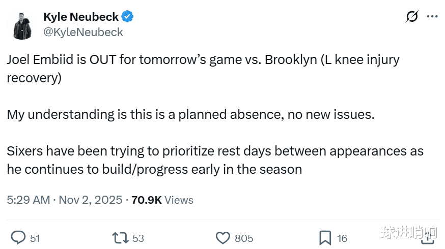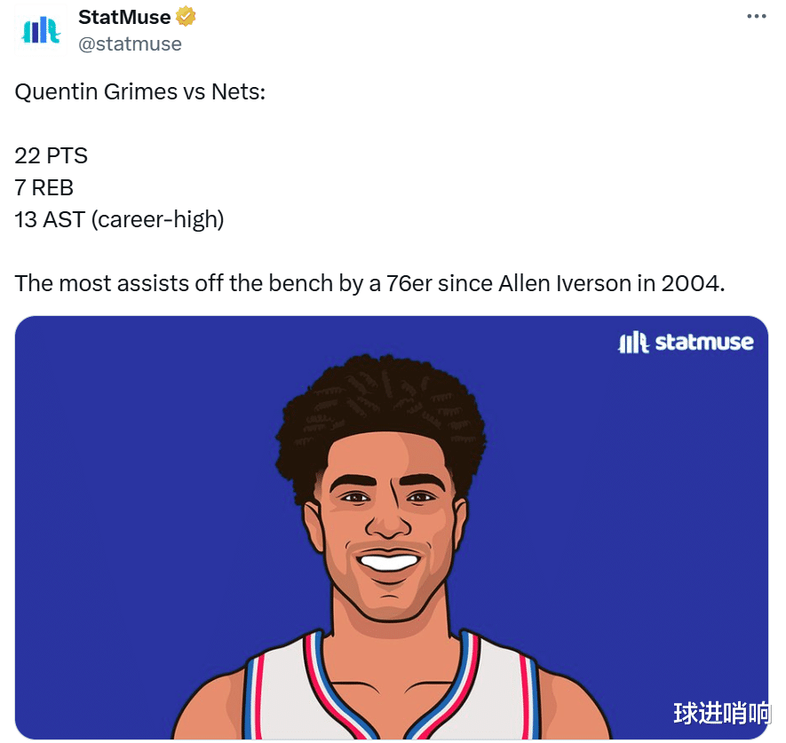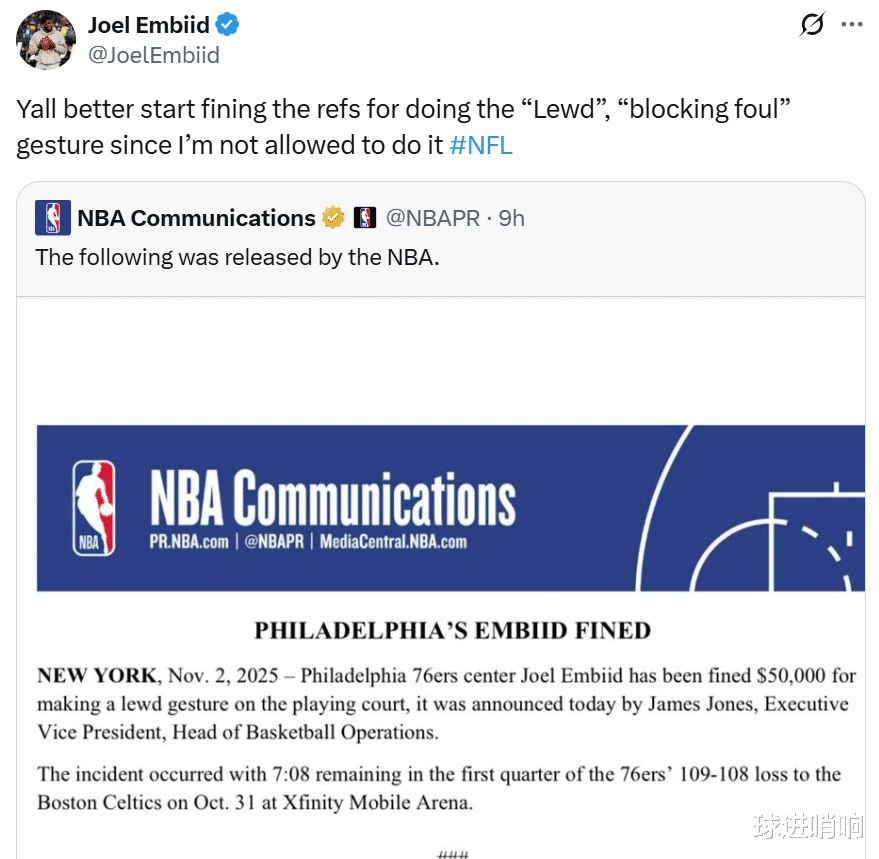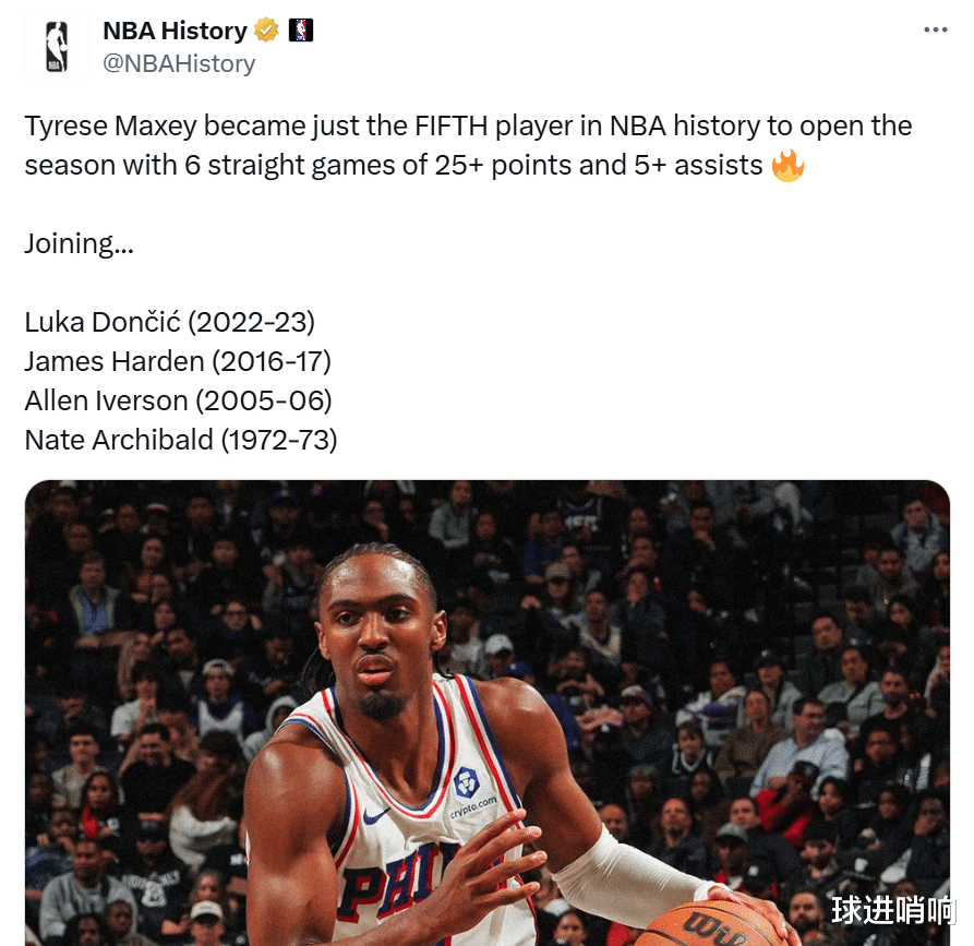 Embiid was fined 50,000 for his "obscene celebration" and also missed the game due to injury management. As a result, the 76ers won by 24 points! The twin stars in the backcourt continue to shine, and O'Neal bluntly said that Embiid should give up power to young people for development.  The 76ers beat the Nets by 24 points  After losing to the Celtics by 1 point in the previous game and missing out on their 5-game winning streak to start the season, the 76ers faced off against the Nets, who were the bottom of the Eastern Conference this season. As you can imagine, the 76ers beat the Nets 129-105 and gave the latter 6 consecutive losses to start the season.  Compared with defeating the Nets and scoring 24 points, what makes the 76ers even more happy is that the team is getting rid of its dependence on Embiid.  With Embiid absent and fined US$50,000 for obscene celebrations, the team's backcourt twin stars Maxey and No. 3 overall pick Edgcomb provided steady output, and the rookie Grimes also broke records and completed his transformation.   Embiid was fined 50,000   Before the start of the game, 76ers reporter Kyle Neubeck revealed that Embiid would miss the game due to left knee injury management. At the same time, he specifically emphasized that Embiid had no new injuries and his absence from this game was already planned.   Embiid's absence is not surprising. After suffering consecutive serious knee injuries, it is not easy for Embiid to return to the game. After the last game against the Celtics, Embiid also publicly admitted that he felt tired.   While missing the game, Embiid also received a $50,000 fine. The NBA officially fined Embiid $50,000 for his indecent celebration in the previous game against the Celtics.  It is worth mentioning that this is not the first time Embiid has been punished. He had been fined $25,000 for this celebration before.   As a result, Embiid was still dissatisfied. He directly forwarded the NBA's penalty report and responded directly: "You'd better punish the referee for the obscene blocking foul action. After all, I was not allowed to do this action."   The referee's "blocking foul" action mentioned by Embiid was to put his hands on his hips and the tiger's mouth on both sides of his hips. It is indeed similar to the obscene action made by Embiid, but the implied meaning is obviously different.  Maxi broke the record   Fortunately, Embiid's absence and the farce of being fined did not affect the 76ers at all. Instead, the team rebounded strongly after Embiid's absence and won a big victory, sweeping away the haze of a 1-point loss in the previous game.   Among them, Maxi easily scored 26+6+7 data. He sent at least 25+5 assists in the first 6 games of the season, becoming the fifth player in NBA history to deliver this feat. The first four players are Doncic (22-23), Harden (16-17), Iverson (05-06) and Archibald (72-73).  The third overall pick continues to explode   In addition to Maxey, after Embiid's absence, the third overall pick Edgecombe returned to a comfortable role and continued to perform brilliantly, scoring 16 points, 2 rebounds, 3 assists and 3 steals.  Not only is he full of presence on both ends of the offense and defense, but his efficiency of 6-for-12 and his scoring explosiveness of 12 points in a single quarter in the second quarter give Edgecombe a bright future and a strong chance of winning the Rookie of the Year award.  Raiders Career Night  While the dual-core backcourt was showing off, Grimes also continued to transform, scoring 22 points on 7-of-13 shooting, 7 rebounds, 13 assists, 1 steal and 1 block.   Not only handed over +32, the highest plus-minus value in the game, but also sent out 13 assists to show his versatile style. Among them, 13 assists in a single game set a new career high for Grimes.  With this performance, Grimes became the first player in the history of the 76ers to do this as a substitute since Allen Iverson in 2004.  O'Neal persuaded Embiid to give up power Obviously, after experiencing a serious injury, Embiid is no longer the best core candidate for the 76ers, especially when Maxey, Edgecombe and Grimes all performed brilliantly on the outside.  O'Neal also talked about this on "The Rich Eisen Show". He advised Embiid to give up power to young players to grow and actively integrate into them.  O'Neal said, "When Embiid returns, will he slow down the young players? In fact, you can have both. Dominique Wilkins once taught me the 'seven points per quarter' principle. This also applies to Embiid. When you have such young players next to you, after you get 7 points, you should give up the power to the young players to let them play." "Joel, you can play lower. Position, make more air cuts without the ball, or even stand directly in the penalty area and call the referee a three-second violation. You can score in other ways. You can completely take into account both. "  "But many times he (Embid) does a lot of unnecessary actions such as holding the ball, fake moves, and shaking left and right, so he must make a decision, whether to hinder the development of young players, or join them to enjoy the game." O'Neal added.