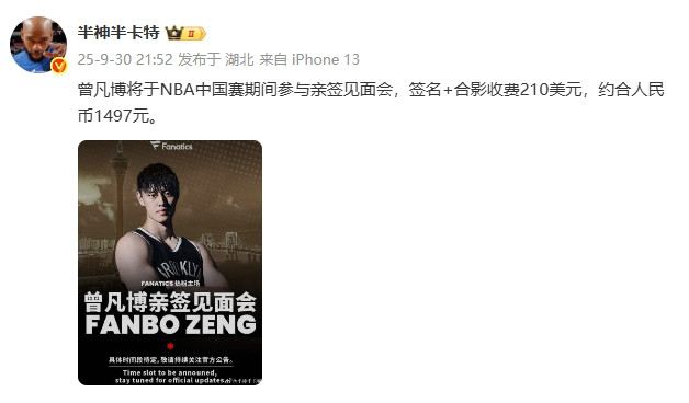 October 1: During this year's NBA China Games, Chinese player and Nets forward Zeng Fanbo will participate in the personal signing meeting. In addition to Zeng Fanbo, celebrities such as Wade, Garnett and Marbury will also attend the personal signing meeting. Recently, media person @后后后后后后 revealed on social media that Zeng Fanbo's signature meeting and group photo charges US$210, which is approximately RMB 1,497. The NBA China Championship held in Macau this year is the Nets and the Suns, with the game time being at 20:00 on October 10 and 19:00 on October 12 respectively.