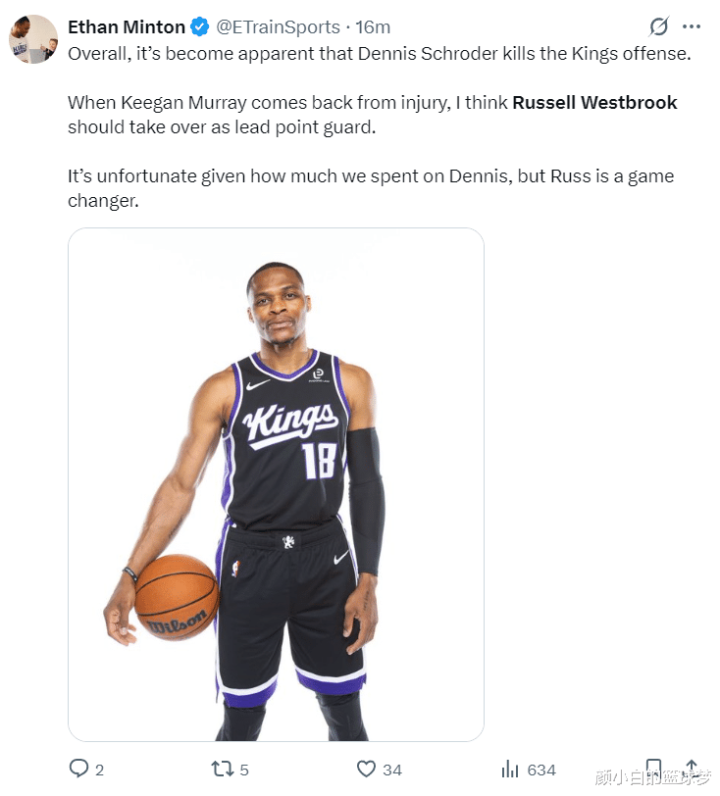 On October 30, the Sacramento Kings ushered in their second back-to-back game. This game was the night LaVine and DeRozan returned to Chicago. Russell Westbrook continued to start. Christie was willing to use this three-guard starting lineup. Westbrook's offensive performance was indeed stronger than Schroeder. Unfortunately, the Kings suffered a three-game losing streak. Westbrook had 12 points and 4 assists.  Westbrook hit another three-pointer in the first quarter, but failed to hit the next two three-pointers. In the first quarter, Westbrook made 2 of 4 + 1 of 3 three-pointers and scored 5 points, 2 assists and 1 steal in 9 minutes of the first quarter. Westbrook at least did not hinder the offense. Schroeder took 0 shots in the first quarter and scored 0 points and 2 assists.  In the second quarter, Westbrook made two breakthroughs and hit all of them. He scored 9 points, 1 rebound, 2 assists, 1 steal and 3 fouls on 4 of 6 in the half. Schroeder made 0 of 3 in the half, scored 1 rebound, 7 assists and 0 turnovers. The offensive effect of the dual point guard Westbrook was better.  The young master's efficiency only declined in the third quarter. He missed a three-pointer and a breakthrough, and relied on free throws to score 2 points. After three quarters, the young master still scored in double figures, but in this quarter the Kings were beaten by the Bulls and fell behind by a score of 39-27. Schroeder was directly abandoned at the decisive moment because of his poor offensive state (2 of 9 shots, 5 points and 7 assists in 28 minutes)  Westbrook also had a five-meter wide open space from the outside, and no one made a three-pointer. In the last quarter, Westbrook did not dare to continue shooting three-pointers. With 2 and a half minutes left, the Kings were 14 points behind and Christie gave up the game. Westbrook made 4 of 9 three-pointers and 1 of 4 three-pointers in 29 minutes, scoring 12 points, 4 assists, 2 rebounds and 3 steals, with a shooting percentage of 44.4%.  Ethan Minton, US reporter: Overall, Schroeder has had a huge impact on the Kings' offense. He is a drag. When Keegan Murray returns, I think Westbrook should be the team's starting point guard. Even though the Kings spent a lot of money on Schroeder, it is obvious that Westbrook is a game-changing player.