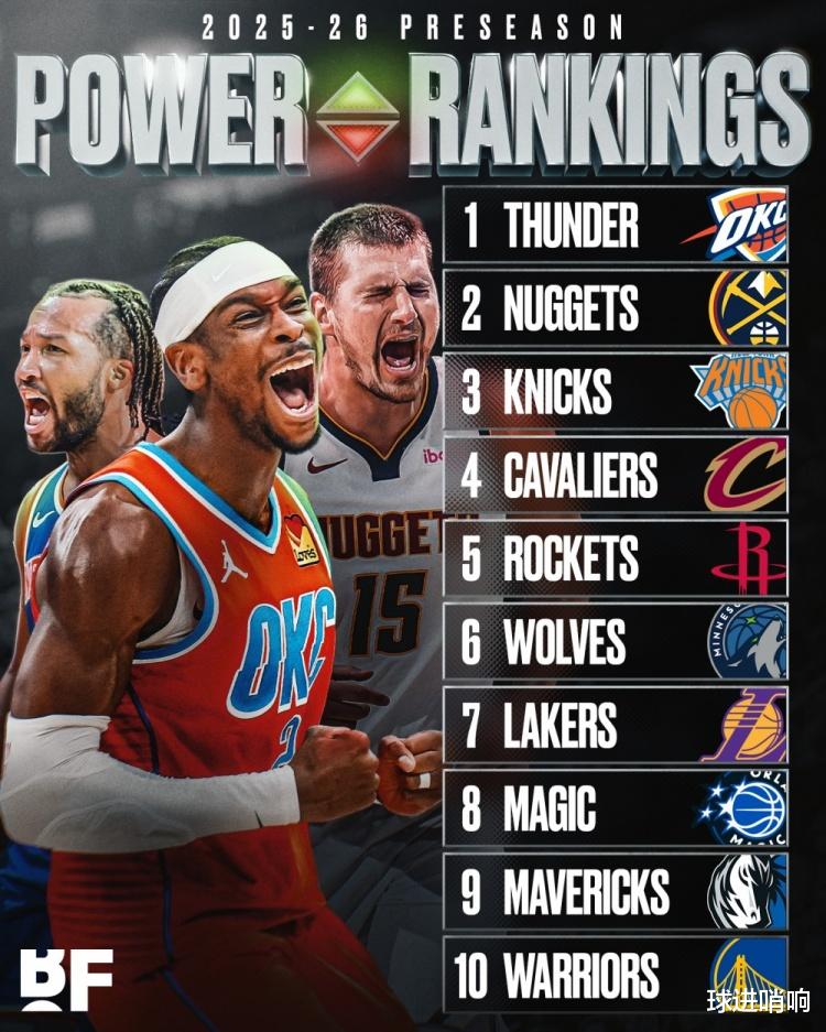 The Warriors are selected! As the preseason begins and the new season begins, the US media "BF" announced the top 10 list of the new season's strength list. Among them, the Lakers are ranked 7th, and the Rockets, who suffered a serious injury from Van Jordan, are still ranked 5th. Tenth place: Warriors The reason why the Warriors were selected is mainly because the core is too old. Curry, Dream Chaser and Butler are all over 35 years old. If you include new aid Horford, the Warriors' core four giants are 147 years old in total. The physical fitness and injury risks caused by age are issues that the Warriors have to face. In addition, the Warriors did not resolve the contract extension issue with Kuminga until before the start of the preseason, and the contract was obviously prepared for a mid-season trade. The embarrassing state of both parties may bring considerable hidden dangers to the Warriors locker room. Ninth place: Mavericks Suffering from injury problems, the Mavericks have been seriously underestimated. If Irving can recover and return in the new season, paired with the full-blooded brother with thick eyebrows and Flagg, who performed extremely well in the preseason, the Mavericks, with the No. 3 pick and size advantage, will also be a reasonable contender for the championship. Eighth place: Magic The young Magic team has reached the stage of achieving results. During the offseason, they also used an 8-for-1 deal to acquire Bane, a prolific marksman, to strengthen the backcourt and shooting. In addition, Tatum is injured and the Eastern Conference is in chaos in the new season. The Magic team has a good opportunity to transform. Seventh place: Lakers With zero transactions during the offseason, the Lakers still completed a comprehensive upgrade of the lineup through Taobao in the buyout market and renewed Doncic's contract. Even if Ayton performed poorly offensively in the preseason, the defensive threat and rebound protection he brings are exactly what the Lakers need most. More importantly, Doncic has completed a significant reduction in weight and is expected to be among the MVPs in the new season. The Lakers are well prepared to go further. Sixth place: Timberwolves The Timberwolves spent a dull offseason, letting go of Alexander Walker, an important piece of perimeter defense, but as a strong team that has reached the Western Conference Finals for two consecutive years. As Edwards continues to grow and the chemistry between core players such as Gobert and Randle improves, the Timberwolves are qualified to occupy this position. Fifth place: Rockets As the biggest winner of the offseason, the Rockets not only acquired Durant at a low price, but also introduced new players such as Finney Smith, Capela and Okogie. In addition, they renewed many core rotations at a low price. The Rockets' lineup is exaggerated and deep, making them a reasonable contender for the championship. Even if the starting core point guard Van Jordan suffers a serious injury, judging from the preseason performance so far, this Rockets team's size, depth, athletic ability and offensive improvement give them hope to achieve a higher ranking when the new season officially starts. Fourth place: Cavaliers The Cavaliers performed impressively last season, established a stable chemical reaction, and are a contender that cannot be ignored in the Eastern Conference. Even if the shortcomings of only Mitchell being relied upon were exposed during the playoffs, as the young Garland and Mobley continue to grow, the Cavaliers have hope of making a comeback in the chaotic Eastern Conference. Third place: Knicks The Knicks have an excellent starting lineup. With the addition of new coach Brown, they are expected to increase the rotation lineup. This will be a protection for the core players, but it will also be a test for the maintenance and continuation of the team's competitiveness. Second place: Nuggets After experiencing internal strife and chaos for many seasons, the Nuggets finally spent an offseason of comprehensive reinforcement after cleaning up last season. Whether it is trading to acquire Cameron Johnson and Varan, or acquiring Bruce Brown and Hardaway Jr. at a minimum salary, it is a huge boost and reinforcement for the Nuggets. Jokic, the number one player in active combat, finally has another chance to compete for the championship. First place: Thunder There is no doubt that the top position belongs to the Thunder. Until a new champion is born, the top position will belong to the Thunder.