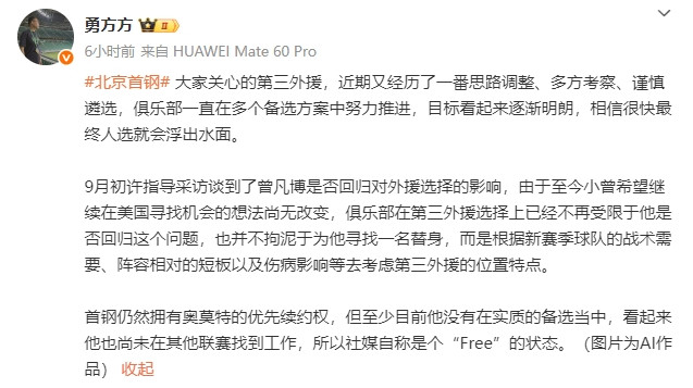 Some players from the Beijing Men’s Basketball Team have officially gone to the National Games, including veterans Zhai Xiaochuan, Fang Shuo, Zhang Cairen, and the injured Fan Ziming. These players will form the Beijing team with Liao Sanning, Zhang Fan and others from the Beijing Enterprises Men's Basketball Team to compete in the National Games. As for Zeng Fanbo's next choice, there is already relatively clear news. According to reporter Yong Fangfang, although Zeng Fanbo failed to enter the NBA before, he still hopes to continue to look for opportunities in the United States. In other words, Zeng Fanbo will not return to play in the Beijing Men's Basketball Team. Zeng Fanbo has always wanted to play abroad, and the NBA is his first choice. Unfortunately, Zeng Fanbo was injured in the semifinals last season, which completely disrupted Zeng Fanbo's plan. Although the Nets later provided Zeng Fanbo with an Exhibit 10 contract and he joined the team at the end of August, he did not return to his best condition at that time. In the China game in early October, the Nets also gave Zeng Fanbo about 10 minutes of playing time in the first game. However, his condition was relatively poor. Not only did he have very few opportunities to touch the ball and did not score, but he was also whistled for three fouls quickly and only contributed one steal, with a plus-minus value of -15. It was precisely because of this performance that Zeng Fanbo was completely abandoned in the second game. After the Nets played in China, they waived Zeng Fanbo. From an ability perspective, Zeng Fanbo is indeed one of the best forwards in the Chinese men's basketball team. He averaged 14.7 points, 4.7 rebounds and 1.9 assists per game last season. But to be honest, there are too many players like Zeng Fanbo in the NBA. Not only does Zeng Fanbo have no advantage, but his physical condition is his disadvantage. Many fans believe that Zeng Fanbo is still far away from the NBA, so it would be better to return to the CBA to play. If he can help the Beijing Men's Basketball Team win the championship, that would also be very good. There was some news on the Internet before, saying that Zeng Fanbo will basically renew his contract with the Beijing Men's Basketball Team. However, judging from what Yong Fangfang revealed, Zeng Fanbo still wants to play abroad and look for opportunities in the United States. Since he can't play in the NBA, then only the Development League is left. Next, Zeng Fanbo is likely to compete in the Development League. From the perspective of ability improvement, it is also good for Zeng Fanbo. But for the Beijing Men’s Basketball Team, Zeng Fanbo’s choice is not so good. The team's head coach Xu Limin said in more than one interview that the team will consider Zeng Fanbo's choice when selecting foreign players. This has also led to the Beijing Men's Basketball Team so far only signing two foreign players, one large and one small, just waiting for Zeng Fanbo. But Zeng Fanbo finally insisted on going to the United States to look for opportunities, so the Beijing Men's Basketball Team also made a decision in terms of foreign aid selection. According to Yong Fangfang, the Beijing Men's Basketball Team no longer considers whether Zeng Fanbo can return, and is not limited to finding a substitute for him. Instead, it considers the position characteristics of the third foreign aid based on the team's tactical needs in the new season, the relative shortcomings of the lineup, and the impact of injuries. In other words, the Beijing Men's Basketball Team has made adjustments in terms of foreign aid selection. Although it is a bit late, there is at least a little more than a month left, so there is still time to operate. In addition, Yong Fangfang also talked about the Beijing Men's Basketball Team's forward foreign aid Omot last season, because if Zeng Fanbo does not come back, the Beijing Men's Basketball Team will basically choose a forward foreign aid. Many fans will think of Omot, who played for the team last season. However, according to Yong Fangfang, although the Beijing Men's Basketball Team has used the priority renewal right for Omot, Omot has not signed a contract yet, but he is not among the candidates for the Beijing Men's Basketball Team. In other words, the Beijing Men's Basketball Team has determined that it will not renew Omot's contract. Looking at it this way, the Beijing Men's Basketball Team should already have more suitable candidates in terms of foreign aid selection. Overall, although Zeng Fanbo's inability to return will definitely have some impact on the strength of the Beijing Men's Basketball Team, the overall strength of the team is good, especially after the introduction of Zhao Rui this summer, the overall strength has been improved. The performance in the new season is still worth looking forward to, and it is still the favorite to win the championship!