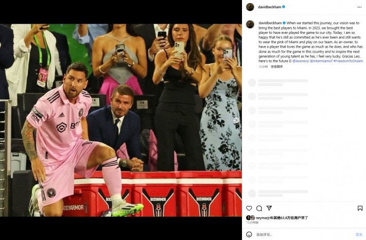 October 24 News On the evening of October 23, International Miami officially announced that it would renew its contract with Messi until 2028. David Beckham, one of the owners of Inter Miami, issued a message to congratulate Messi on his contract extension: When we embarked on this journey, our vision was to bring the best players to Miami. In 2023, we successfully brought the greatest player of all time to the city. Today, I'm extremely happy that he remains as determined as ever and still wants to put on Miami's pink jersey and play for our team. As a team owner, I feel very lucky to have a player who loves football, has made a huge contribution to football in this country and inspires the next generation of young talent. Thank you, Leo, and look forward to the future together. Antonella and Neymar then liked Beckham’s social media. According to previous reports from the Post and AS, Miami is exploring the introduction of 33-year-old Neymar. However, Santos has not received a formal offer from Miami for Neymar and plans to renew Neymar's contract.