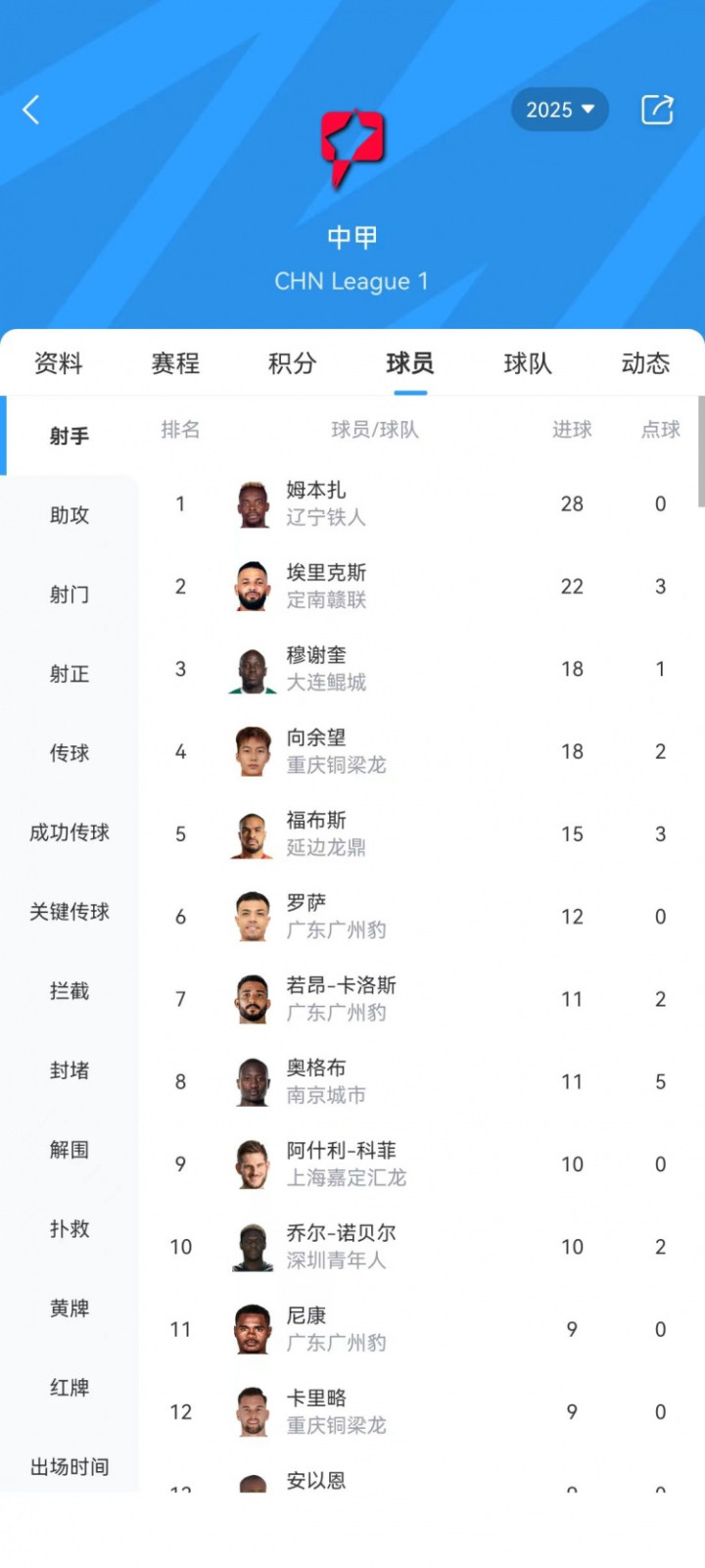China League One scorer list: Mbenza leads with 28 goals, Erics is second, Xiang Yuwang is fourth with 18 goals