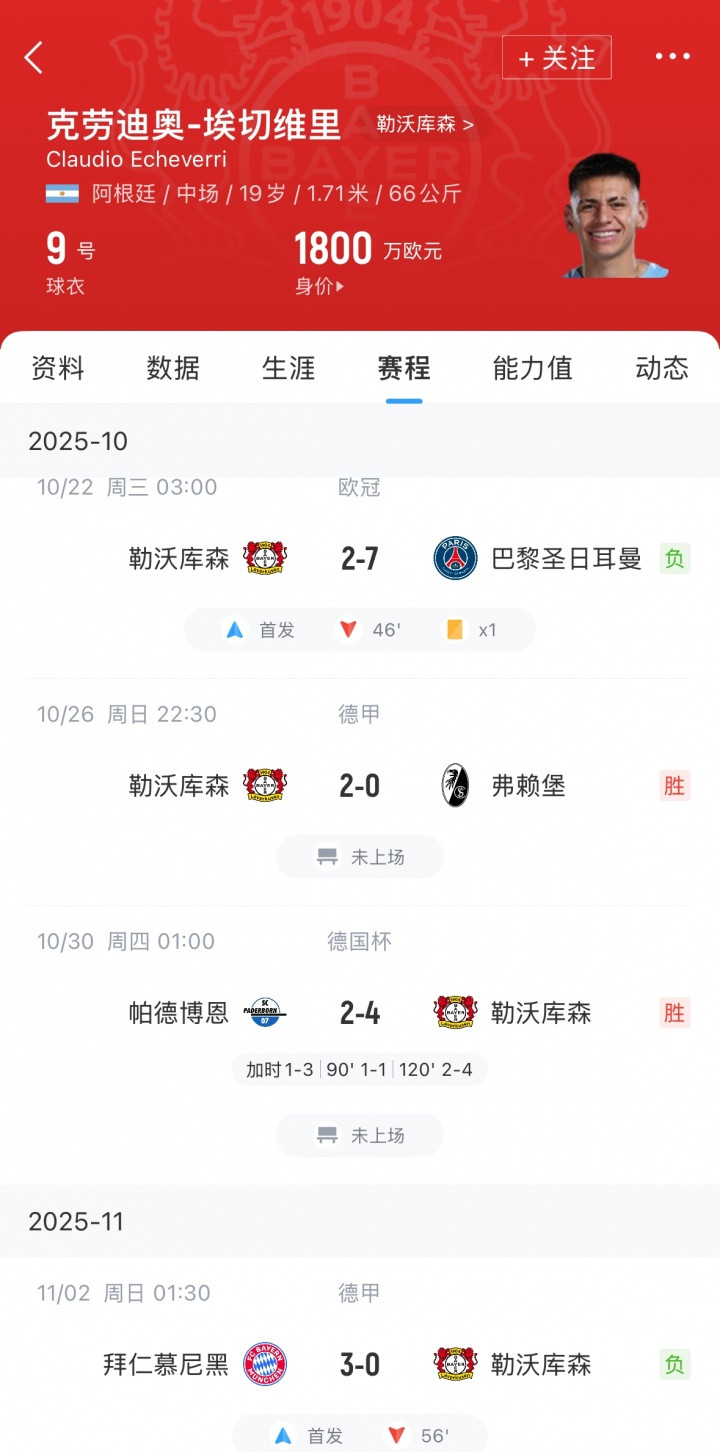 November 02: In the 9th round of the Bundesliga, Bayern 3-0 Leverkusen. In this game, Leverkusen's 19-year-old midfielder Echeverri was replaced in the 56th minute after starting the game. Echeverry touched the ball 33 times and made 26 passes, with a passing success rate of 92.3%, 1 interception, and all 3 ground confrontations failed. After being loaned to Bayer Leverkusen from Manchester City, Echeverri has currently played in 7 games and provided 1 assist in 183 minutes of playing time. Echeverry started against Paris and Bayern, but in the middle of the Bundesliga against Freiburg and the German Cup against Paderborn, Echeverry failed to get a chance to play.