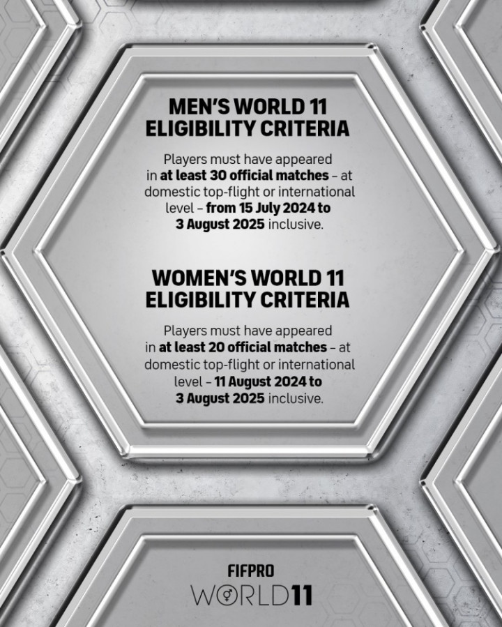 Eligibility criteria for FIFPRO s best 11 of the year: men s football team plays 30 games, women s football team plays 20 games