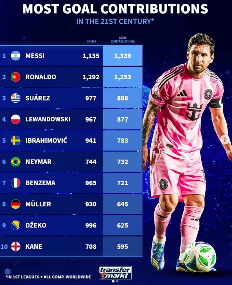 Germany s top scorer list in the new century: Messi scored 1,339 goals in 1,135 games, Ronaldo scored 1,253 goals in 1,292 games