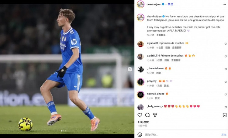 November 24th: Real Madrid drew with Elche 2-2 in this round of La Liga. New central defender Huizen scored his first goal in Real Madrid's career. In the 78th minute, Arnold took a corner kick from the right into the penalty area. Bellingham headed the ball down from the front and Huizen scored. Heizen also posted on social media after the game: "This is not the result we wanted, nor is it the goal we strive for, but the team's performance in this field is still very good." "I am honored to score my first goal for this great team. Madrid forward!"