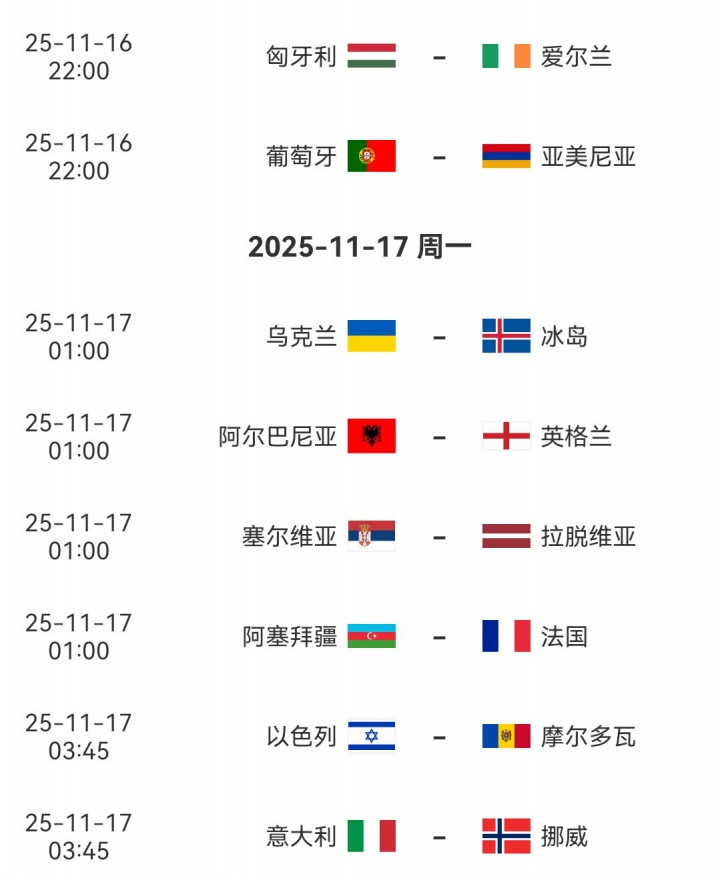 November 16th: The European World Cup qualifying matches in the early morning of November 16th have all come to an end, and no new team has been formed to qualify for the 2026 World Cup in the United States, Canada and Mexico. The three teams of Belgium, Spain and Switzerland were expected to qualify one round ahead of schedule, but Spain and Switzerland were limited by the results of another match in their respective groups. Due to Belgium's draw with Kazakhstan, the suspense of promotion will not be settled until the final round. Tonight and early tomorrow morning, many teams will play, among which Portugal will face Armenia and Italy will face Norway. Teams that have qualified for the 2026 World Cup: United States, Mexico, Canada, Japan, New Zealand, Iran, Argentina, Uzbekistan, South Korea, Jordan, Australia, Brazil, Ecuador, Uruguay, Paraguay, Colombia, Morocco, Tunisia, Egypt, Alger Ghana, Ghana, Cape Verde, South Africa, Qatar, England, Saudi Arabia, Cote d'Ivoire, Senegal, France, Croatia Participating teams in the intercontinental play-offs: New Caledonia, Bolivia Today and tomorrow morning schedule: