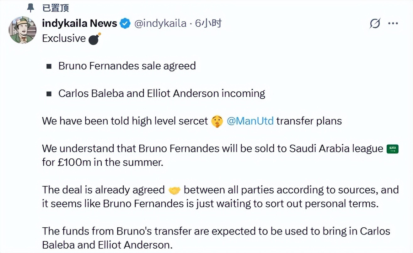 On October 8, 2025, according to the exclusive news of the foreign media "indykaila News", Premier League giant Manchester United decided to sell B fee (Bruno Fernandez) to Saudi team for 100 million pounds. It is reported that this news comes from Manchester United's internal transfer plan. Now that the parties have agreed, they are about to enter the signing stage, only FEB is still dealing with the details of the personal terms. It is understood that the 100 million pound transfer fee income will be used to introduce two players, Baleba and Elliott. In fact, a few days ago, the British media Manchester Evening News reported similar news. According to the Manchester Evening News, the Saudi team once again made a quote for Manchester United player B's fee: transfer fee of 100 million pounds + weekly salary of 700,000 pounds + tax exemption. It can be seen that the Saudi team seems to have a special liking for this Manchester United star. You should know that B Fee is now 31 years old and has a net worth of only 50 million euros. He has not performed well under Amorin. It is already a sky-high price to generate 100 million pounds of revenue for the team. These are not counting. The Saudi team is really rich, and it actually increased its salary for B to 700,000 pounds per week, and it is a tax-free figure. At this stage, B's weekly salary at Manchester United is 300,000 pounds, and Saudi Arabia's salary is more than twice that at Manchester United. Maybe looking at the weekly salary of 700,000 pounds alone is nothing, but we can tell the problem by comparing it. Manchester City's thigh and world-class striker Haaland's weekly salary is only 525,000 pounds. It can be seen from comparison that both personal treatment and transfer fees are indeed very attractive. For Manchester United, maybe B's departure is a good thing. Not to mention, this 31-year-old veteran can bring the team a transfer income of 100 million pounds, which has made a huge contribution. In the eyes of many fans, it seems that it is dawn for Manchester United. From this point of view, this incident is indeed a good thing for Manchester United. But some people are worried that if B fee leaves, then Manchester United will have even fewer midfielders. Judging from Manchester United's performance in recent years, their performance has not improved. It seems that it is no longer a simple problem for players or coaches, but a problem in many aspects. If you look at the coach, Amorin seems to be more unreliable than Tenhager. At the same time, there are indeed problems with the players. Manchester United players such as Master La, Hoylund, Greenwood, etc. cannot play football even when they stay in Manchester United, but it is like cheating as soon as they leave. It can be seen that Manchester United's problem is no longer just at the player or coach level. However, it is not in the player transfer window now, and the above B-fee transfer transaction cannot be carried out immediately, which also makes people feel a little confused. If it is a transfer during the winter window period, then the negotiations are a little too early. Do you think the B fee will go to Saudi Arabia with a weekly salary of 100 million + 700,000 yuan? Welcome to leave comments and communicate together.