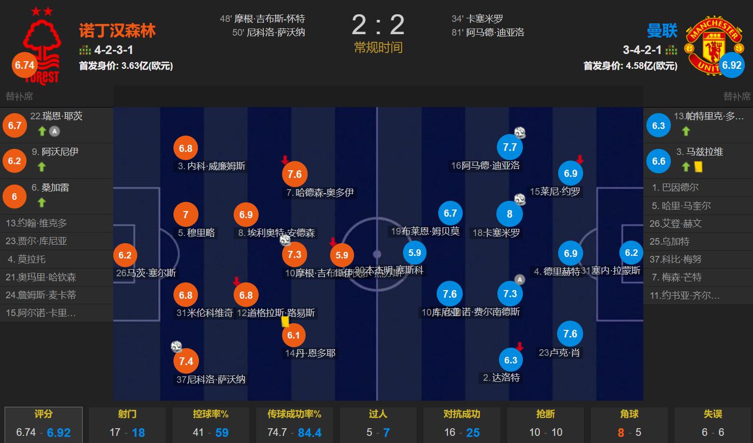 At 23:00 on November 1st, in the 10th round of the Premier League, Nottingham Forest faced Manchester United at home. In the first half, Manchester United broke the deadlock with a header from Casemiro on a controversial corner kick. Manchester United led 1-0 at halftime. In the second half, Gibbs White and Savona completed the lead with 2 goals in 3 minutes, and Ahmed equalized the score. In the end, Manchester United drew 2-2 away with Nottingham Forest, ending their three-game winning streak in the league. Nottingham Forest vs. Manchester United, Dyche formed a 4231 formation, with a starting price of 363 million euros; Amorim formed a 3421 formation, Sheshko came forward, followed by Cunha and Mbemo, Dalot, B Fee, Casemiro, and Amad formed a four-midfielder, Luke Shaw, Dericht, and Yoro formed a three-back, Lamens was in goal, and the starting price was 458 million euros. Manchester United exposed many old problems in this campaign. Dalot cannot play as a wing-back at all and is not a good choice for the 3421 formation. After the game, he only scored 6.3 points, the third lowest score for Manchester United. Lamence has highlighted several games, but the problem of Manchester United's goalkeeper position still exists. Nordin Hansen Forest scored 2 goals in 3 shots on target. This is definitely a problem with goalkeeper Ramens. After the game, Ramens only scored 6.2 points, the second lowest score for Manchester United. The center position Sheshko was sleepwalking throughout the game. After the game, he only scored 5.9 points. He was the only player with unqualified ratings in this campaign. The summary is that Manchester United is weak in the center, left wing back and goalkeeper positions. The three consecutive wins in the Premier League have an element of luck. Manchester United's first goal in this campaign was not a corner kick at all, because Manchester United drew 2-2 away from the relegation team Nottingham Forest. There is an element of luck, and there are still many problems left for Amorim. Any mid-to-lower team knows how to play Manchester United, which is to defend and counterattack. Amorim's 3421 formation is seriously insufficient in offensive ability, which will cause Manchester United to frequently lose points against weak teams. In the entire game, Manchester United had a ball possession rate of 59%, with a total of 18 shots, 7 of which were on target; Nottingham Forest had a total of 17 shots, of which 3 were on target. Manchester United drew with Nottingham Forest. This Manchester United fan was miserable. He said that Manchester United won five consecutive victories before getting a haircut. Maybe he has to wait for several seasons. Will his hair grow to his waist by then? We'll see.