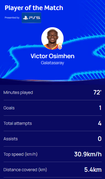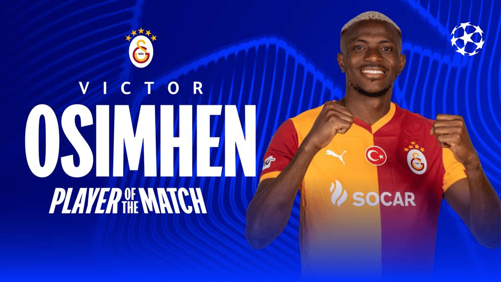 Tiger Pulp October 1st In the Champions League stage, Galatasaray defeated Liverpool 1-0 at home, and Osmayen scored the winning penalty in the game. He was also named the best player of the game by the UEFA technical team after the game.