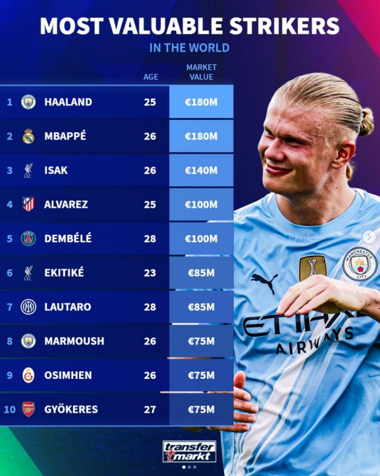 Happy Sports > Football > Ranking of centre-forward transfer prices: Haaland and Mbappe have the highest 180 million euros, Isaac 140 million euros