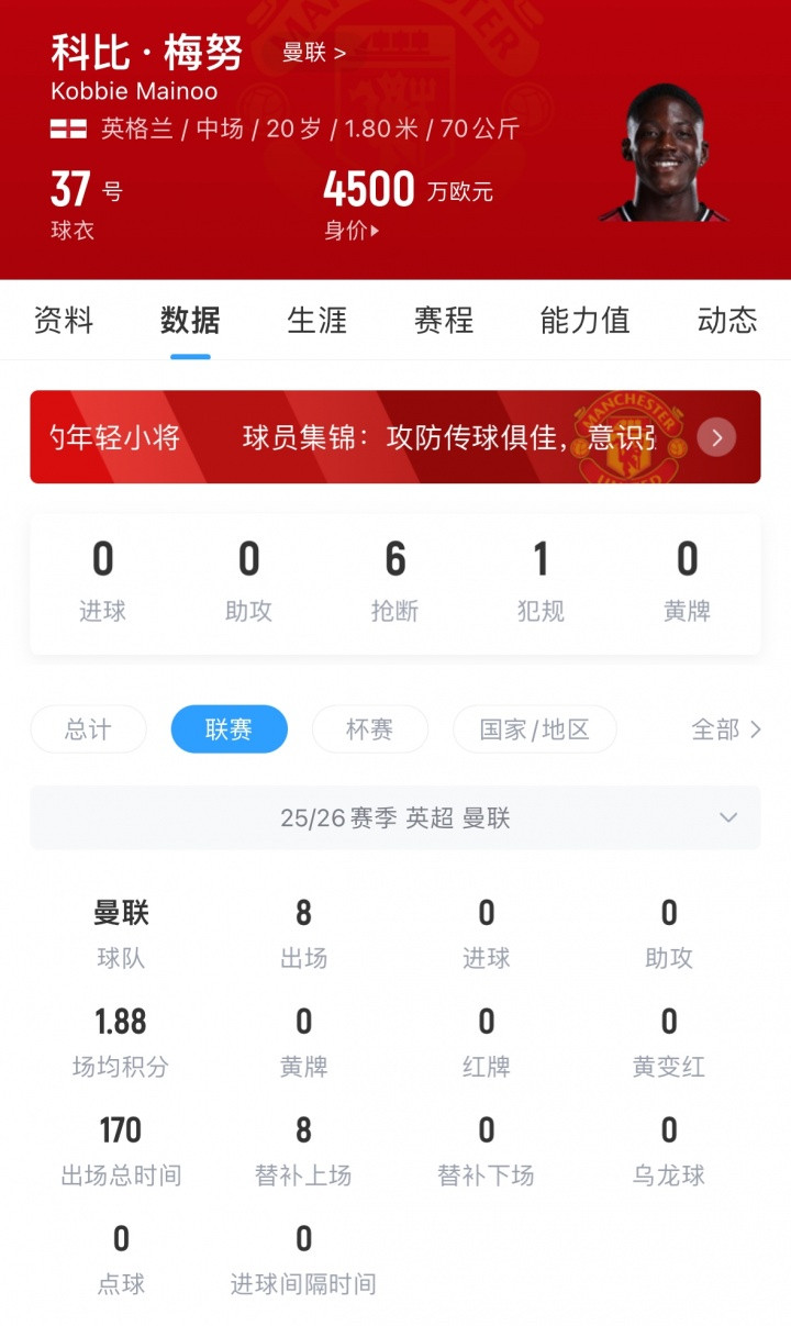 In the 12th round of the Premier League on November 25, Manchester United lost 0-1 at home to ten-man Everton. Menu came on as a substitute in the 58th minute of this game. This is Menu's 8th appearance in the Premier League this season. All 8 appearances were as substitutes, and the total duration was only 170 minutes. According to previous reports from Romano and other media, Menu had applied to leave the team on loan this summer due to concerns about playing time, but Manchester United rejected this proposal. The 20-year-old Manchester United youth training youngster is currently worth 45 million euros in Germany and has not yet contributed goals or assists.