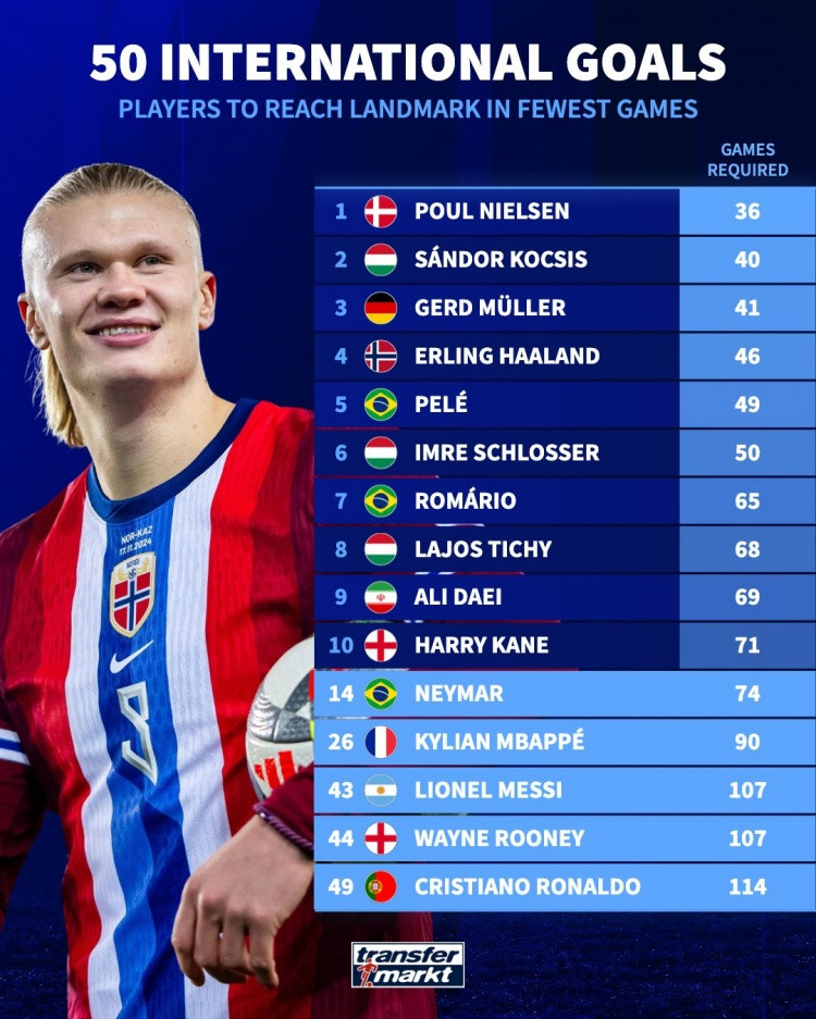 The fastest number of games to reach 50 goals for the national team: Haaland 46 games, Messi 107 games and Ronaldo 114 games