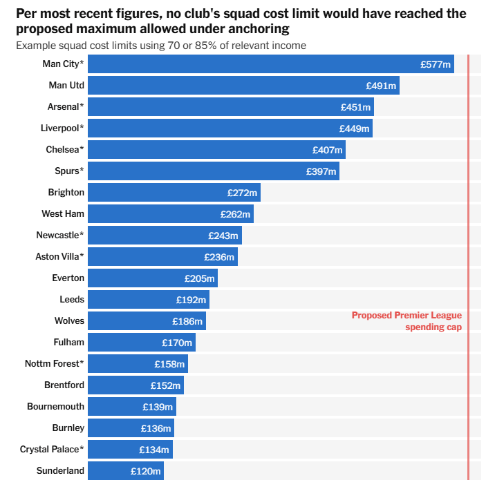 Hupu, November 20th The AthleticUK sports and financial reporters analyzed this Friday’s Premier League 20 team meeting, which will have a profound impact on the future Premier League and even European football patterns. What is an anchoring mechanism? First of all, this name is worthy of its name. The top-down anchoring mechanism (TBA) will impose a cap on club spending on wages and transfer fee amortization (including agent commissions), linked to the financial position of a club with the lowest revenue. The TBA is anchored by the central broadcasting and sponsorship revenue allocated to clubs by the Premier League, with the proposed cap set at five times the amount allocated to the poorest clubs. In the 2024-25 season, Southampton will earn £109.2 million while finishing at the bottom of the league, which means that if the anchoring mechanism is implemented at that time, the cap will be set at £546 million. It is predicted that if the anchoring mechanism is implemented in the current 2025-26 season, as the new TV broadcast contract cycle begins, the revenue allocated to clubs is expected to increase, and the anchoring cap will be increased to 600 million pounds. In theory, the introduction of an anchoring mechanism would further limit spending, as clubs can only increase team spending based on increases in league television revenue. Other proposals, such as the team costs rules (see SCR below), are linked to clubs' income, whereas the anchoring mechanism applies to all clubs - hence its name as a 'salary cap'. The monies allocated to clubs have also been net of various Premier League costs. In this sense, if the anchoring mechanism is adopted on Friday and legal action is then triggered, as some quarters have threatened, the costs incurred by the league in responding to the litigation will result in the anchoring limit being lower than it would otherwise be. What does "anchoring" mean to every Premier League club? For the vast majority of clubs, at least it won't change anything directly. While we don't know how the cap will be adjusted in future seasons, according to the latest figures, only four Premier League clubs have revenues above the £600m reference cap mentioned above. This remains true even when adding in the average of player earnings over the past three seasons (which counts towards the club's "relevant turnover" for the purpose of calculating SCR, see below). If the anchoring mechanism is passed, the following six clubs will have to pay close attention to its impact immediately. These six clubs - Arsenal, Chelsea, Liverpool, Manchester United and Tottenham Hotspur - usually compete regularly in European competitions (Manchester United being the only exception this season). Therefore, according to UEFA’s team cost control (SCR) system, their expenditure on team costs has been limited to 70% of relevant revenue, but the hard upper limit stipulated by the anchoring mechanism may be lower than the 70% upper limit that needs to be observed in the European competition. The broader impact of setting a hard cap on spending is difficult to determine. What can reasonably be expected is that even if this increases the likelihood of some players moving to overseas clubs with higher spending caps, it will also slow down the growth of player wages. If a club breaches the fixed cap, it will only be penalized on the second breach. The penalty is an immediate deduction of 6 points, followed by an additional deduction of 1 point for every £6.5 million of overspending. What is SCR? For Premier League clubs, the Team Cost Rules (SCR) are no strangers, mainly because the SCR was originally introduced by UEFA a few years ago and has been quietly implemented this season and last season. The SCR limits the club's expenditures on players and managers. These expenditures include wages paid to players and managers, related amortization costs (i.e., the cost of introducing or renewing players) and any agent fees incurred during the introduction or renewal process. Unlike UEFA, the Premier League version of the spending cap will be calculated based on the season (that is, 8-6), rather than based on the natural year. Whether the 85% cap will cause compliance issues for the 11 clubs that have not participated in the European competition this season will naturally vary depending on the specific circumstances. Some clubs, such as Brighton and Brentford, have less to worry about due to their already low ratios of wage and transfer fee amortization to revenue. This is not the case for some other clubs with higher ratios. According to the latest statistics, in the 2023-24 season, the total wages and amortization costs of Aston Villa, Bournemouth and Nottingham Forest all exceeded 120% of turnover. This includes the full wage costs of these clubs (the SCR will only consider player and manager fees), but obviously direct restrictions on team spending will have an impact. Everton, Fulham and Wolves have also shown higher wage-plus-amortization ratios in their recent financial reports. Who supports these proposals and who opposes them? Let’s first take a look at the staunchly opposed party. Although they will not have a vote at tomorrow's shareholders' meeting, the Professional Footballers' Association (PFA)'s position has been made clear: imposing a salary cap will face legal action. PFA chief executive Mahta Molango, who held talks with Premier League captains earlier this week, said litigation would be "inevitable" if clubs are asked to implement what the union considers to be a hard salary cap. The UK's three largest agencies - CAABase, Stellar and Wasserman - have made similar threats to the Premier League. The prospect of further legal challenges may have affected the judgment of all parties last week, but ultimately the key decision will be made by representatives of the 20 Premier League clubs in a closed meeting in the conference room tomorrow. This is not a simple shareholders' meeting, and 