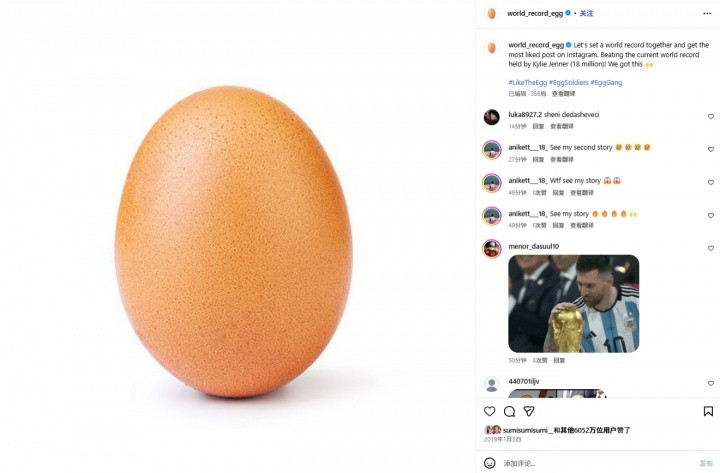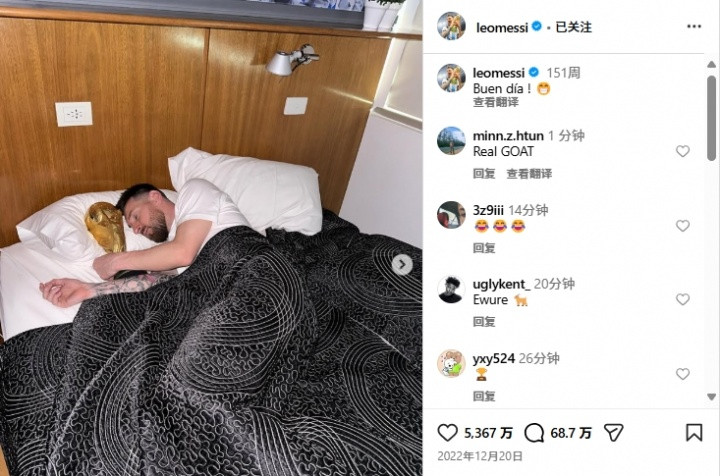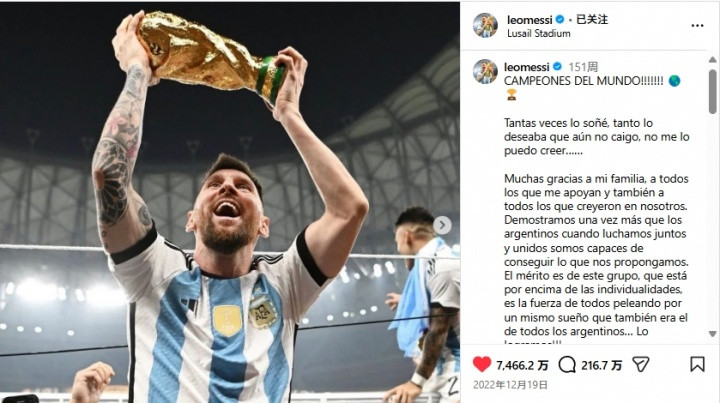 November 12th Less than two days ago, Messi posted a photo of his night visit to Camp Nou on Instagram. The post currently has 26 million likes, which is still more than 5 million behind the 10th post. The top ten likes in the history of ins (the latest data as of today): 1-Messi’s social media post to celebrate winning the World Cup, 74.662 million 2-An egg, 60.52 million 3-Messi posted a picture on social media of sleeping with the Hercules Cup: 53.67 million 4-C Ronaldo posted on social media a photo of LV advertising with Messi, 41.506 million 5-Messi Social media took a photo with the Hercules Cup on the plane, 41.13 million 6-Messi posted a picture on social media and returned to Argentina to celebrate winning the World Cup, 33.62 million 7-Riyadh Victory officially announced that Ronaldo has joined, 33.28 million 8-After being eliminated from the 2022 World Cup, Cristiano Ronaldo posted a post, 33.1 million 9-Messi social media posted a LV advertisement with Cristiano Ronaldo, 31.97 million 10-Cristiano Ronaldo and Georgina co-created, the two announced they have twin children, 31.61 million