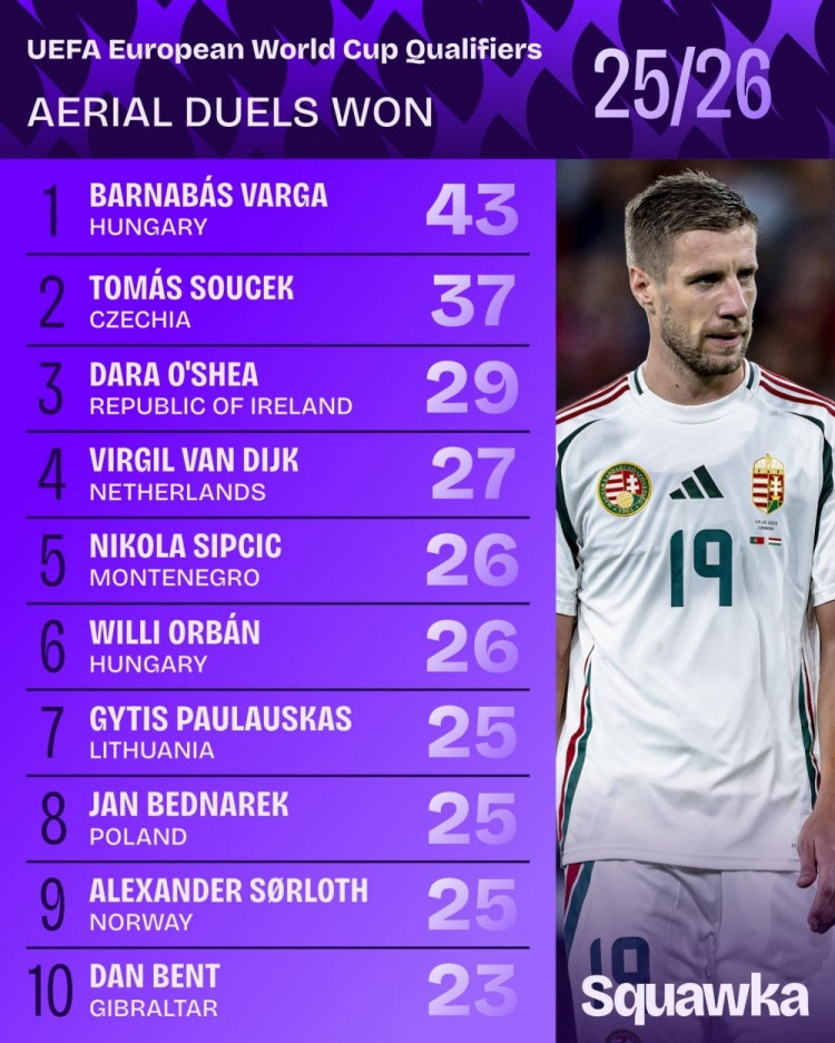 November 20th: This World European qualifying group stage has come to an end. Squakwa also counted the success of the competition in this tournament, and Van Dyke ranked fourth. The list of successes in this World European Preliminary: 1. Barnabas Varga (Hungary), 43 times 2 Tomas Soucek (Czech Republic), 37 times 3. Dara O'Shea (Ireland), 29 times 4. Virgil van Dijk (Netherlands), 27 times 5. Nikola Hipcic (Black Mountain), 26 times 6. Willy Orban (Hungary), 26 times 7. Gitis Paulauskas (Lithuania), 25 times 8. Jane · Bednarek (Poland), 25 times 9. Alexander Serlot (Norway), 25 times 10. Dan Bent (Gibraltar), 23 times
